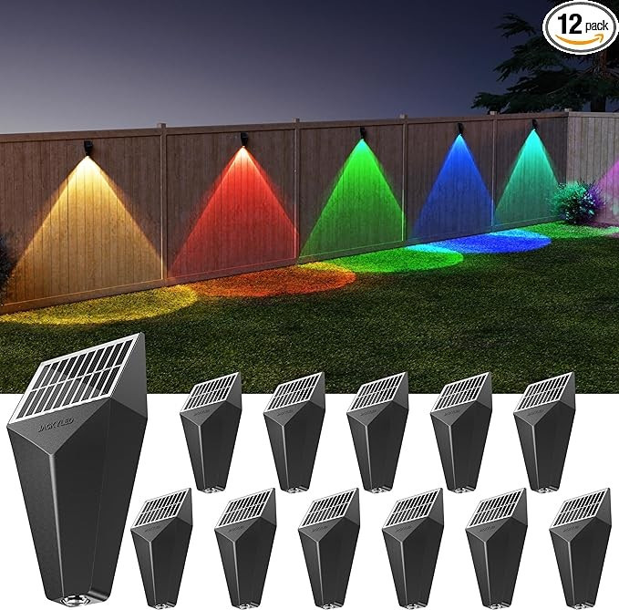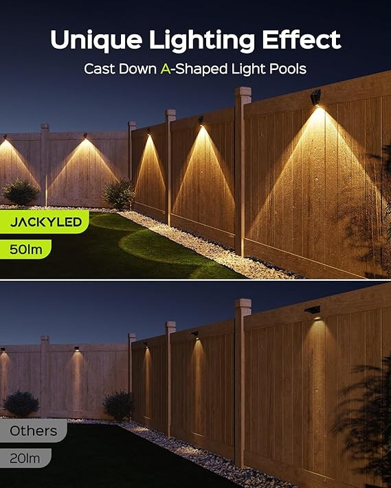【Unique A-Shaped Lighting】Designed by JACKYLED professional lighting engineers, this solar fence lights cast down beautiful A-shaped light cones on your patio fences or wall and ground, adding a touch of welcoming delight to your outdoor backyard. Whether you are playing with your kids or walking the dog, these solar powered deck lights are always standing by to witness your happiness.