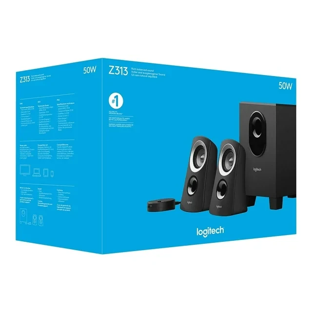 Say goodbye to tiny computer speakers and dull sound. With the Logitech Speaker System Z313, it's easy to have the big listening experience you've been missing. The convenient control pod puts volume control at your fingertips. 25 watts (RMS) of power fills your room with dynamically rich and balanced music. The compact subwoofer fits in tight spaces, such as under your desk, producing deep bass you can feel. And setup is a snap. Just connect the system to your computer and you're done.